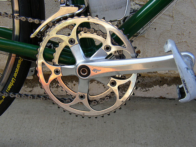 now mounted to a Dura Ace bb, fenders, black tape, and a few other