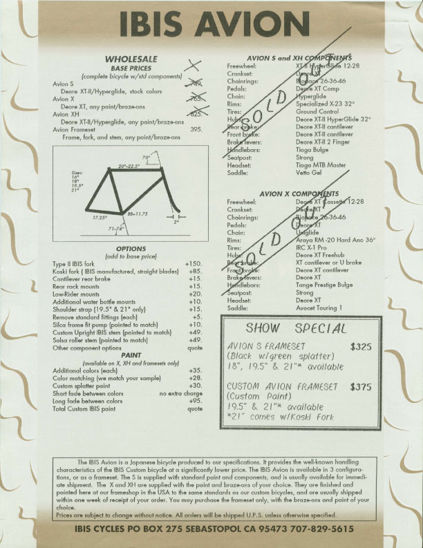 Ibis 1989 Dealer Catalog - Avion pricing & specs